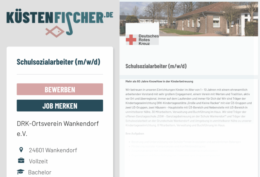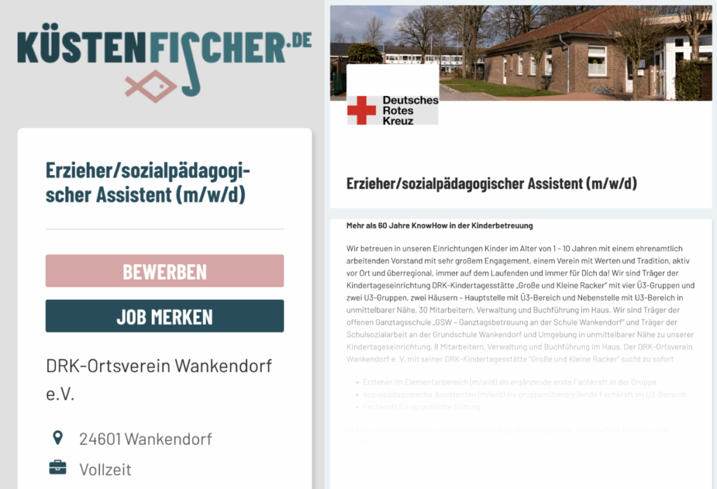 StartseiteAndere Angebote Stellenangebote by Notes 4U 6. Januar 2025 written by Notes 4U Mehr als 60 Jahre KnowHow in der Kinderbetreuung„Mit Familien, Für Familien“. Mit Leidenschaft, aus Überzeugung immer UpToDate!Wir betreuen in unseren Einrichtungen Kinder im Alter von 1 – 10 Jahren mit einem ehrenamtlich arbeitenden Vorstand mit sehr großem Engagement, einem Verein mit Werten und Tradition, aktiv vor Ort und überregional, immer auf dem Laufenden und immer für Dich da!Wir sind Träger der Kindertageseinrichtung DRK-Kindertagesstätte „Große und Kleine Racker“ mit vier Ü3-Gruppen und zwei U3-Gruppen, zwei Häusern – Hauptstelle mit Ü3-Bereich und Nebenstelle mit U3-Bereich in unmittelbarer Nähe, 30 Mitarbeitern, Verwaltung und Buchführung im Haus. Wir sind Träger der offenen Ganztagsschule „GSW – Ganztagsbetreuung an der Schule Wankendorf“ und Träger der Schulsozialarbeit an der Grundschule Wankendorf und Umgebung in unmittelbarer Nähe zu unserer Kindertageseinrichtung, 8 Mitarbeitern, Verwaltung und Buchführung im Haus.Aktuelle Stellenangebote: Erzieher / Sozialpädagogische Assistenten (m/w/d)für mind. 30,0 WochenstundenAb: sofortweitere Informationen (PDF-Download) Wir freuen uns auf Ihre vollständige Bewerbungmit aussagekräftigem Lebenslauf schriftlich oder per Mailan die DRK-Kindertagesstätte „Große und Kleine Racker“. Sozialpädagogische Assistenten (m/w/d)für 35,0 Wochenstundenin Festanstellung Ab: sofortweitere Informationen… Erzieher (m/w/d)undSozialpädagogische Assistenten (m/w/d)für mind. 30,0 Wochenstundenals Schwangerschafts-/Elternzeitvertretung(mit der Option auf Übernahme in einen Festvertrag)im Elementarbereich.Ab: sofortweitere Informationen… FSJler*innen gesucht! Die DRK-Kita „Große und Kleine Racker“ist offizielle Einsatzstelle für Interessierte.Bewerben Sie sich jetzt bei unsfür ein Freiwilliges Soziales Jahr in unserer Einrichtung!Alle Informationen dazu finden Sie hier. Wir freuen uns auf Ihre vollständige Bewerbungmit aussagekräftigem Lebenslauf schriftlich oder per Mailan die DRK-Kindertagesstätte „Große und Kleine Racker“. Das bieten wir ein motiviertes Team feste Gruppenstrukturen moderne Technik offene Ohren freundliche Eltern 95 Kinder im Alter zwischen dem ersten und siebten Lebensjahr ca. 120 Kinder im Alter zwischen dem siebten und elften Lebensjahr einen modernen Arbeitsplatz Bezahlung nach TVöD bzw. SuE 30 Tage Jahresurlaub Regenerations-/Umwandlungstage (SuE) Heiligabend / Silvester frei nach TVöD Jahressonderzahlung ab dem ersten Jahr VBL – Altersvorsorge ab Vertragsbeginn Vermögenswirksame Leistungen interne Fortbildungstage, externe Fortbildungsmöglichkeiten 6. Januar 2025 0 comments Email